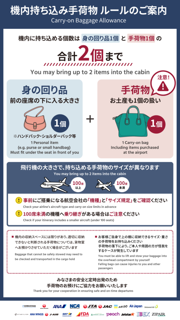 ① 持ち込み個数について:機内にお持ち込みいただけるのは、身の回り品1個 + 手荷物1個の合計2個までといたします。